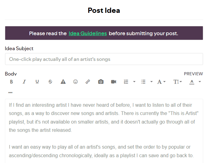 For Spotify, I am saying why I want this feature. It’s going to let me discover more artists and songs. This is in the best interest of Spotify, I helped connect the dots, and the PM has an easier time prioritizing this idea. I also mention why the workaround, the “This is Artist” playlist, fails, if the PM didn’t know about this.