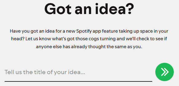 Spotify has a more built out feedback system, built around their community. It’s a forum where you can see if your idea was already submitted and you can upvote ideas, which reduces duplicates, and adds more data to ideas.