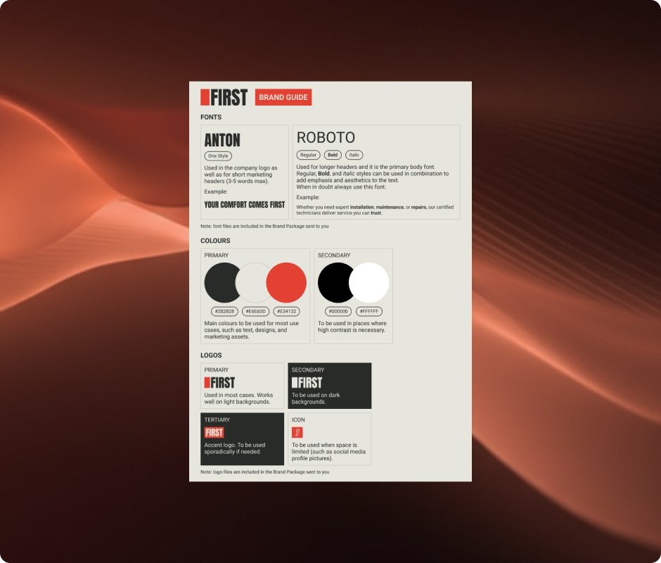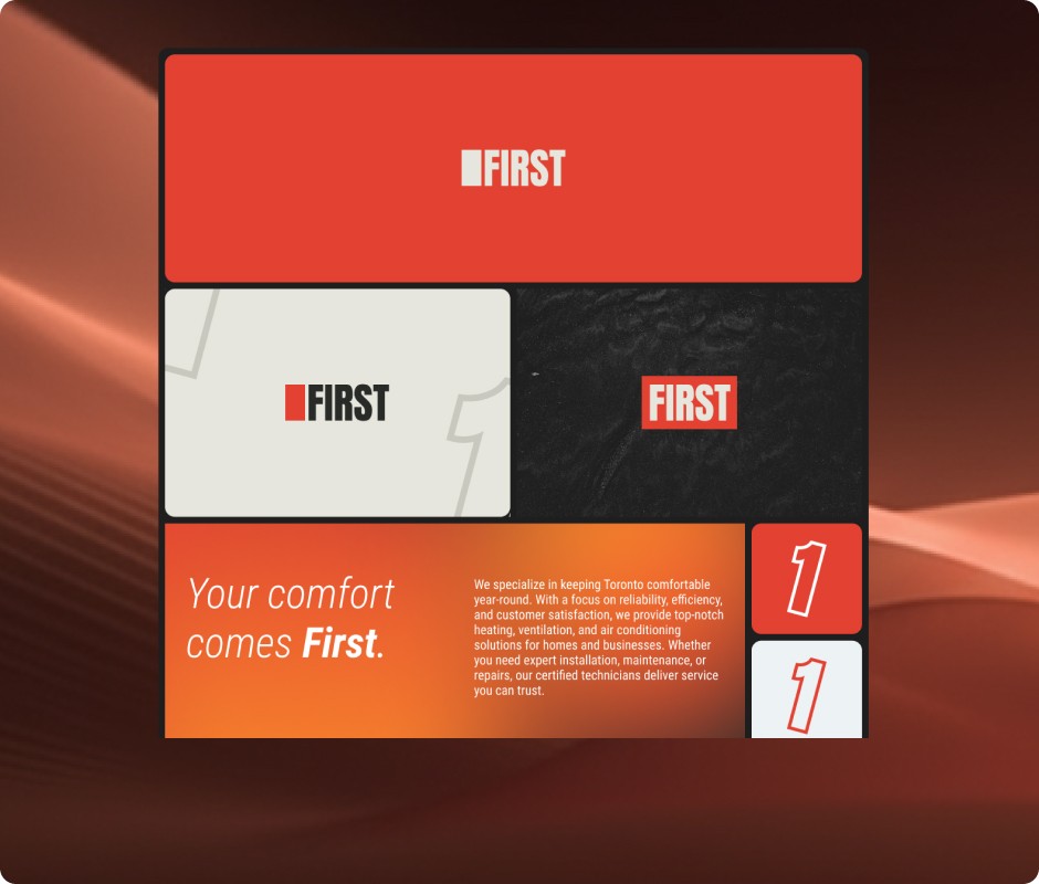 We explored a range of ideas to capture FIRST HVAC’s personality: reliable, warm, and professional. The final logo is bold and confident, designed to look great on service vehicles, uniforms, and online.