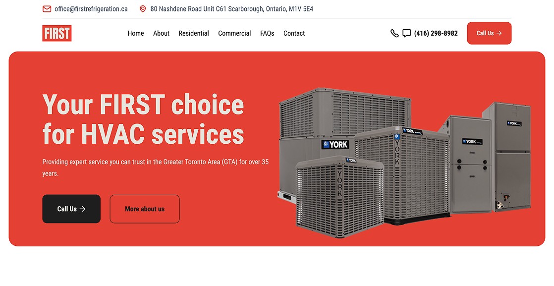 FIRST Refrigeration Engineering Ltd. is a family-owned HVAC company serving the Greater Toronto Area since 1988. Built on craftsmanship and care, the brand delivers reliable heating, cooling, and refrigeration solutions with a personal touch that customers trust